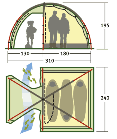 KSL ROVER 3 - удобная семейная палатка с высоким куполом и просторным спальным отделением. В тамбуре с легкостью поместится взятый с собой багаж и кемпинговая мебель, в нем можно с удобством расположиться на стульях за обеденным столом. Высота в самом центре купола палатки составляет 195 см, которая позволяет находится внутри в полный рост.